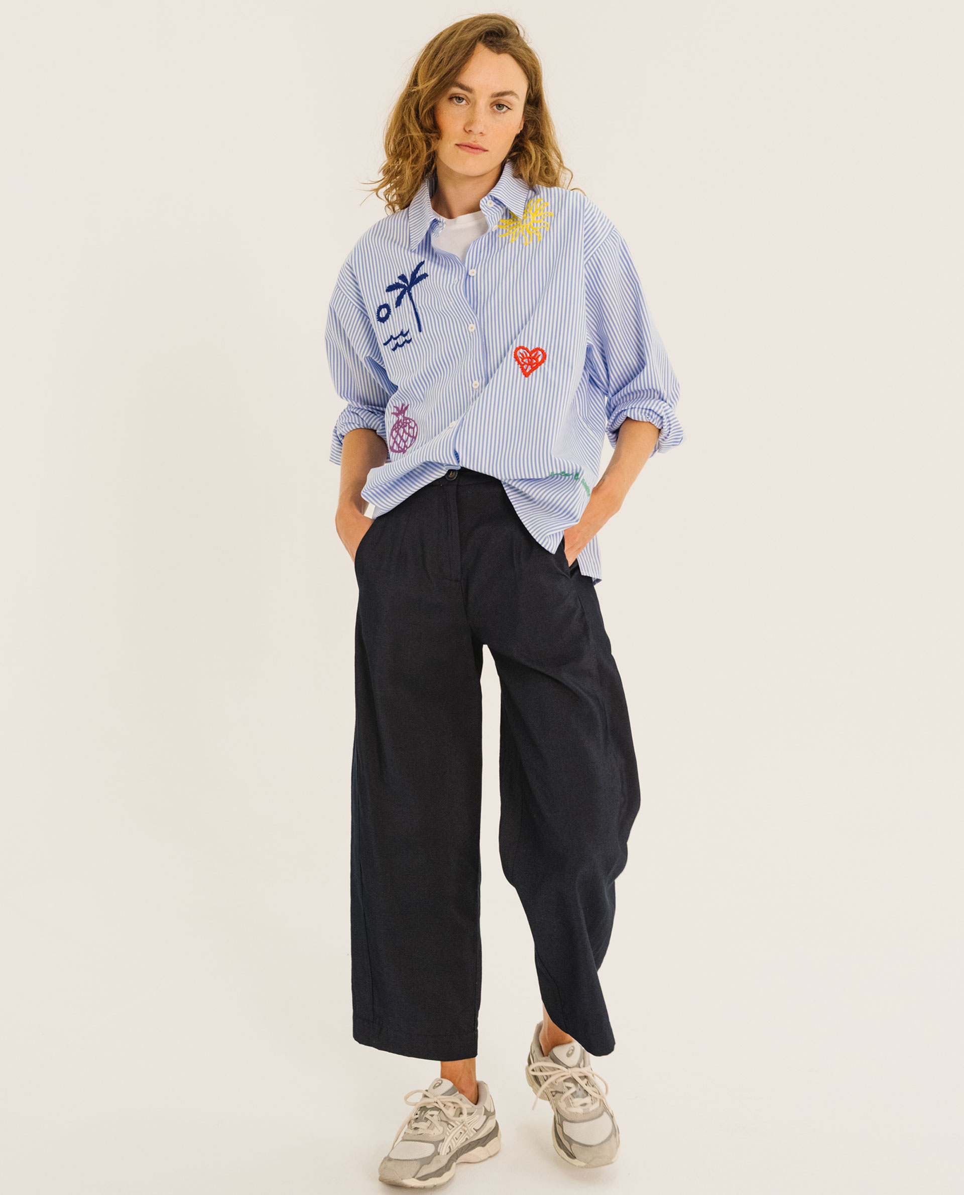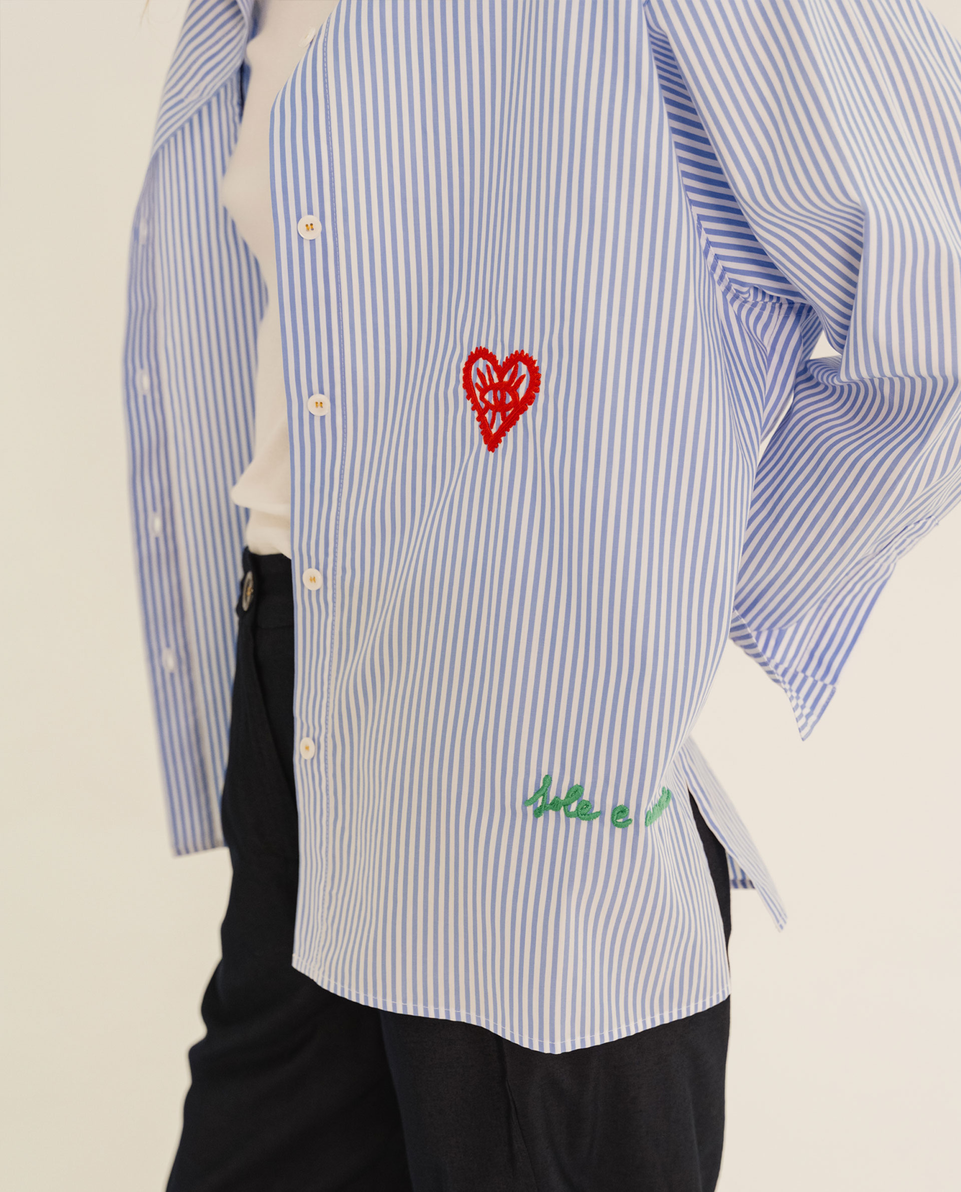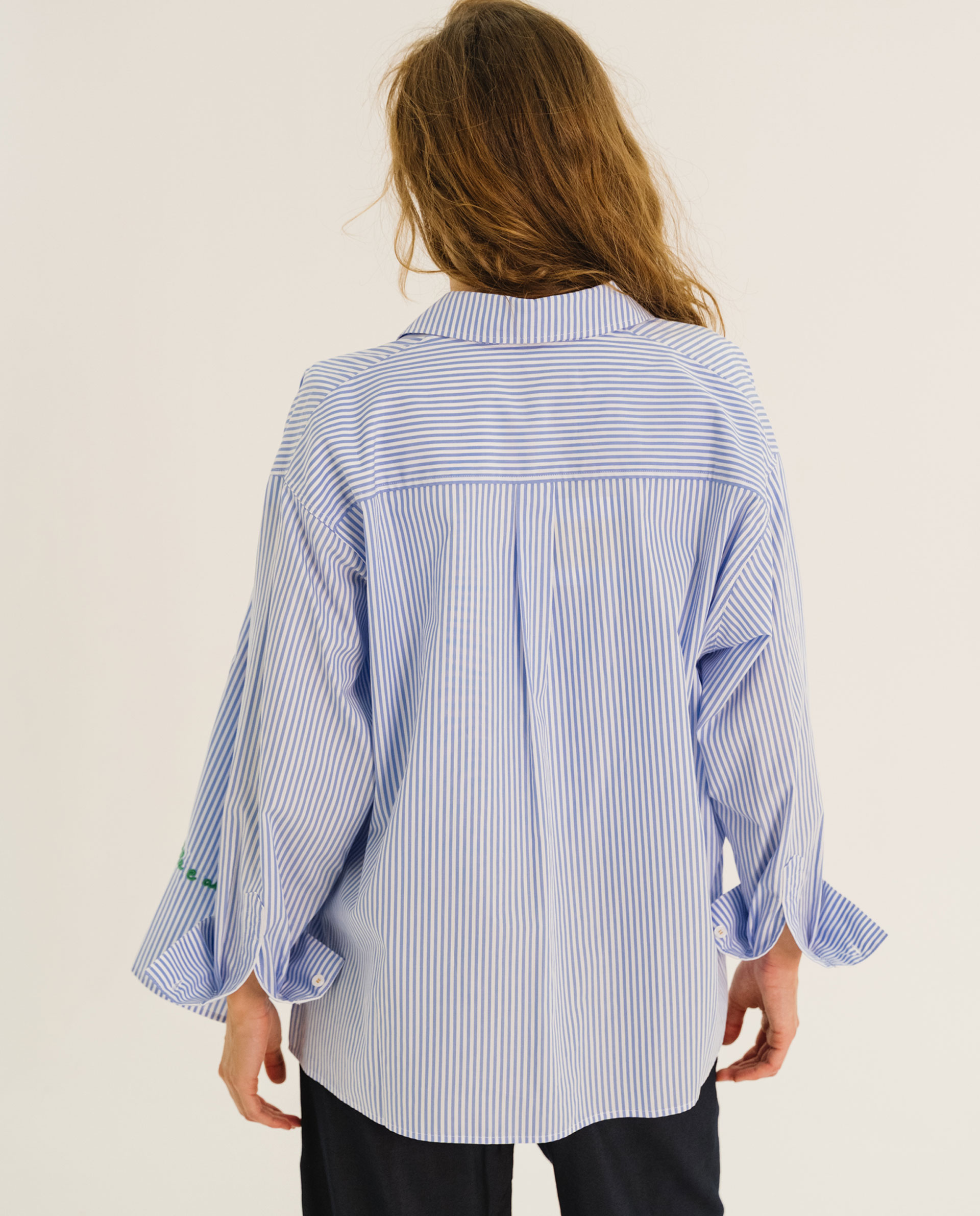 La chemise est coupée dans une popeline rayée tissée en Espagne, elle est ensuite brodée de motifs exclusifs.