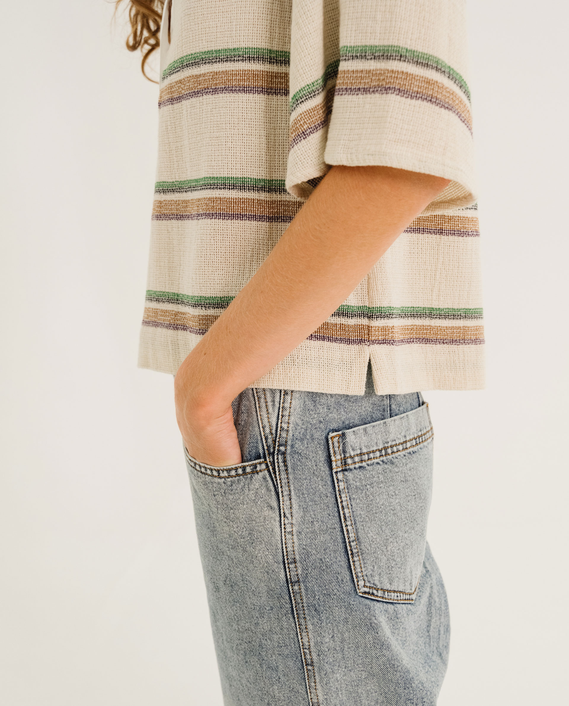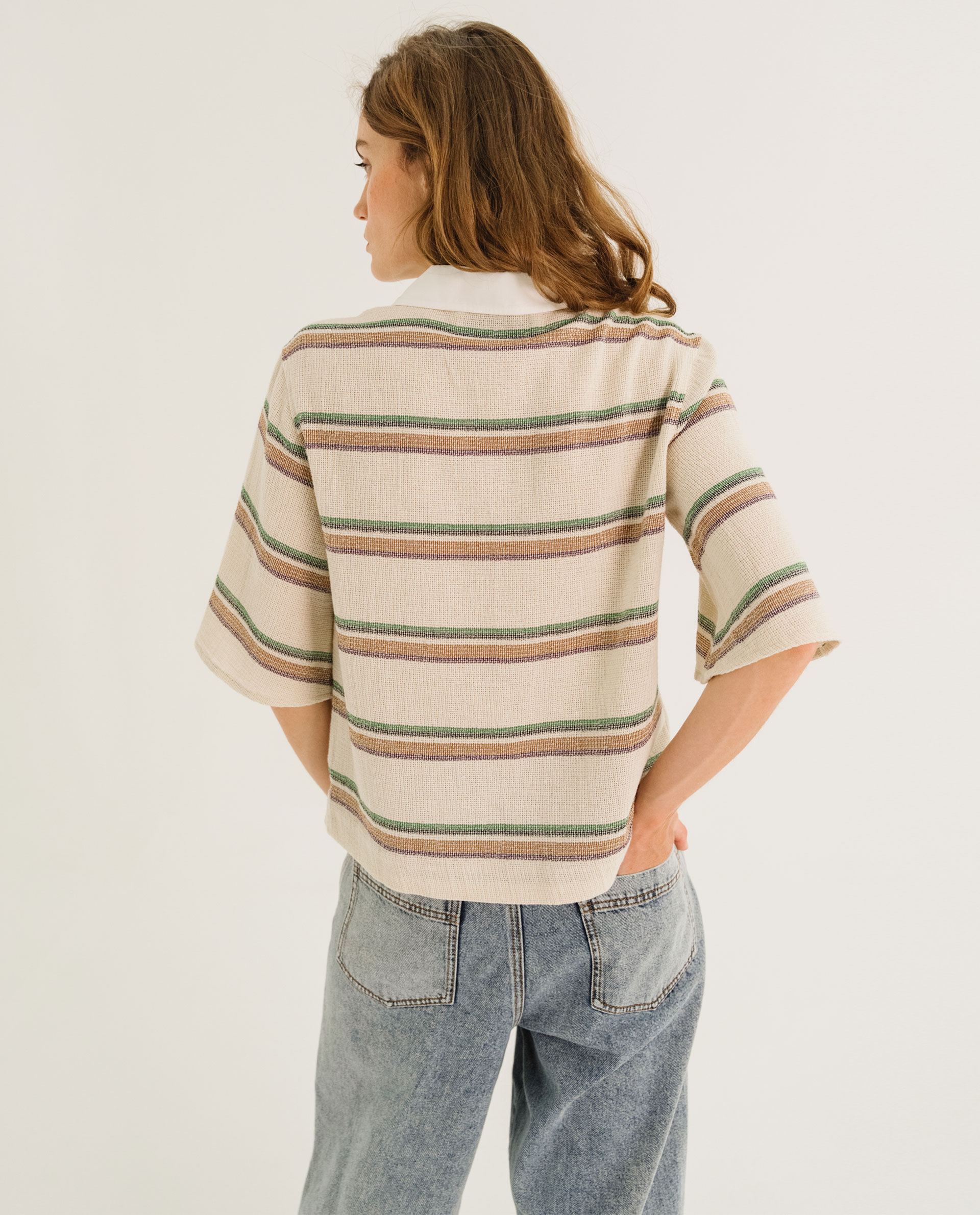 Polo court coupe droite à manches 3/4 évasées, large ourlet sur les bas avec fentes aux côtés.