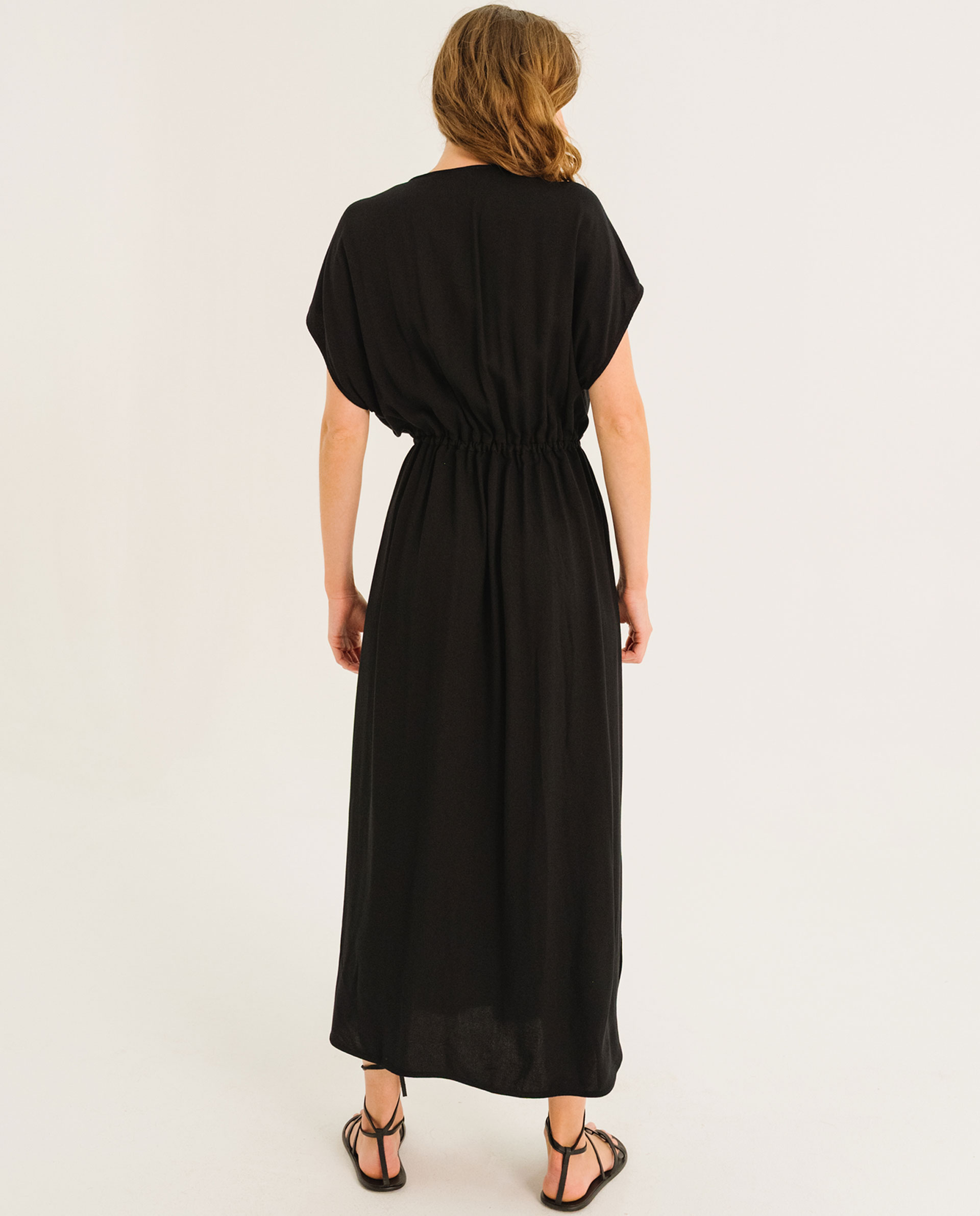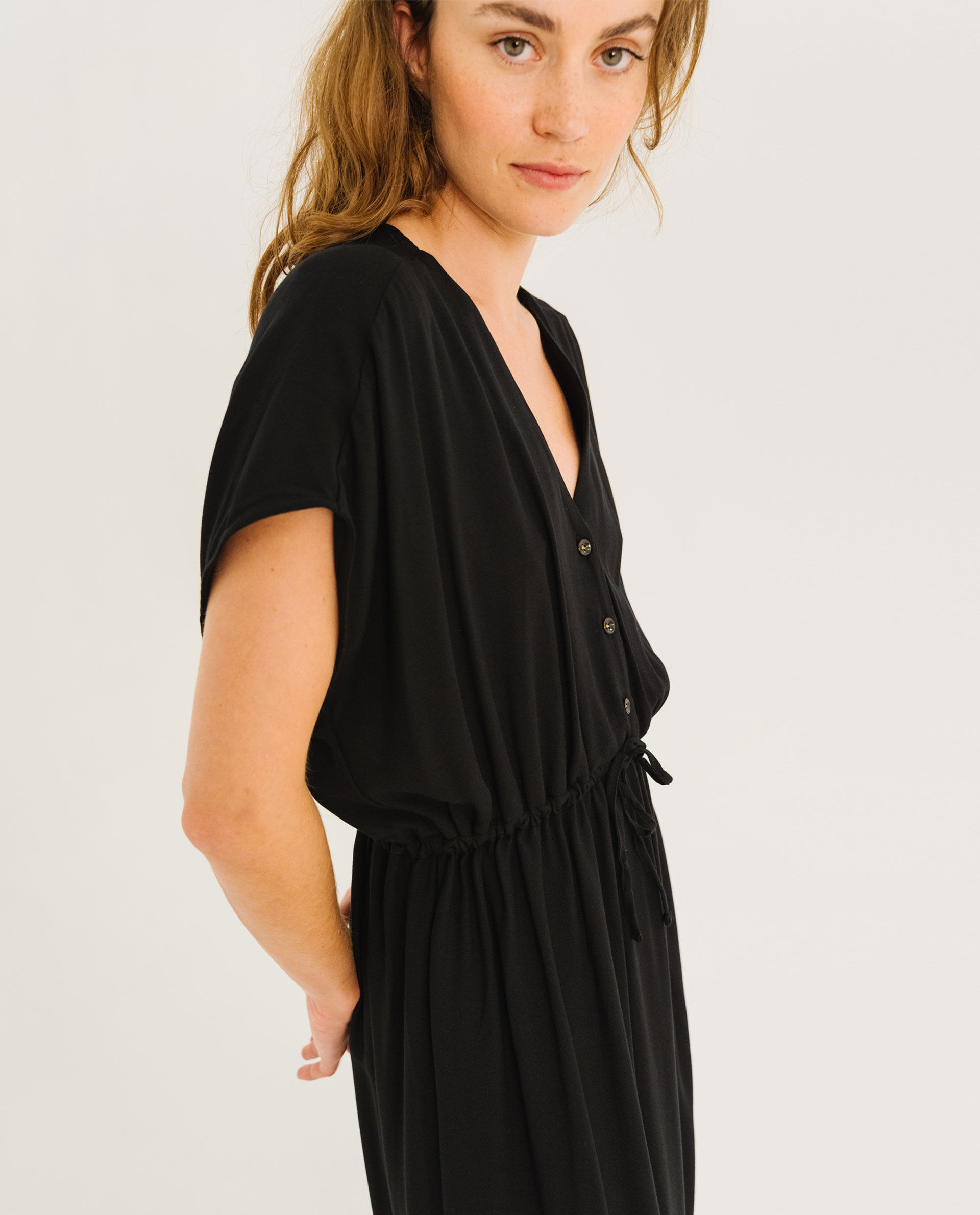 Robe à manches courtes, à encolure en V boutonnée et à taille élastiquée.