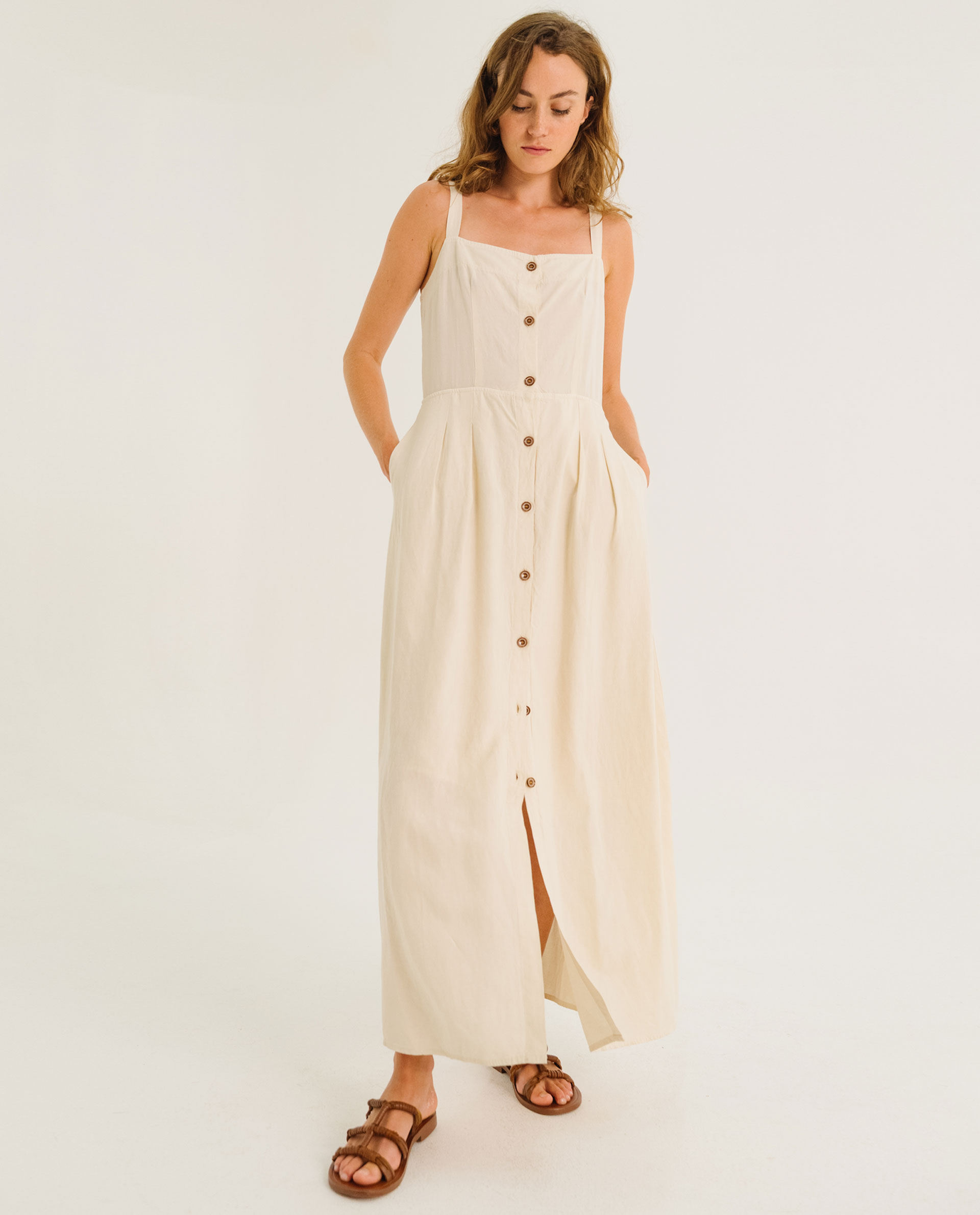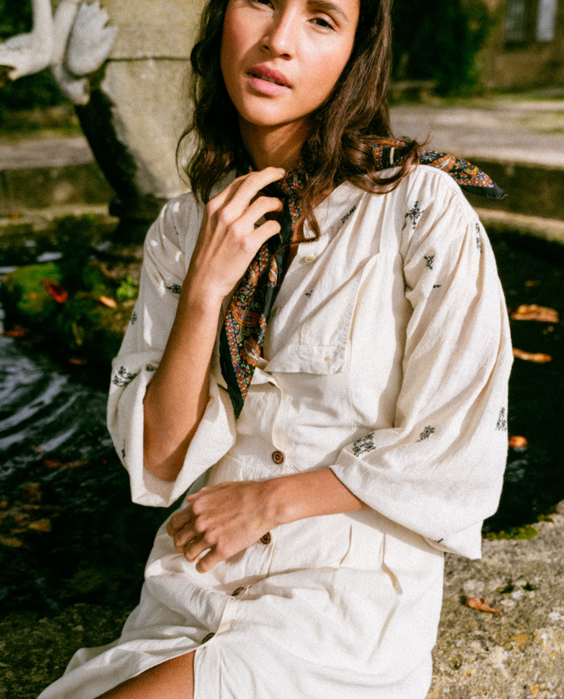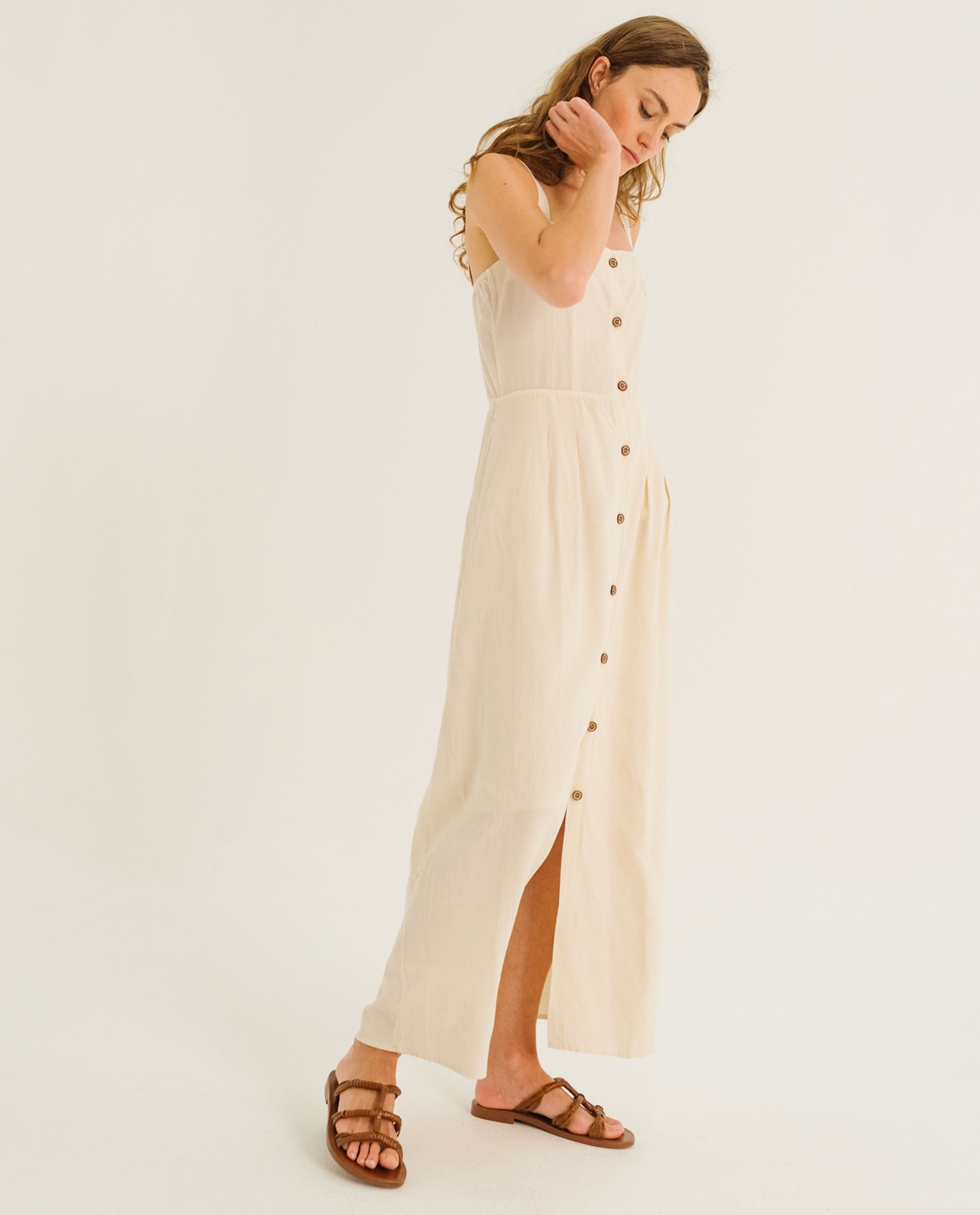ERELL est coupée dans une toile fluide et féminine en mélange de lin et de viscose.
