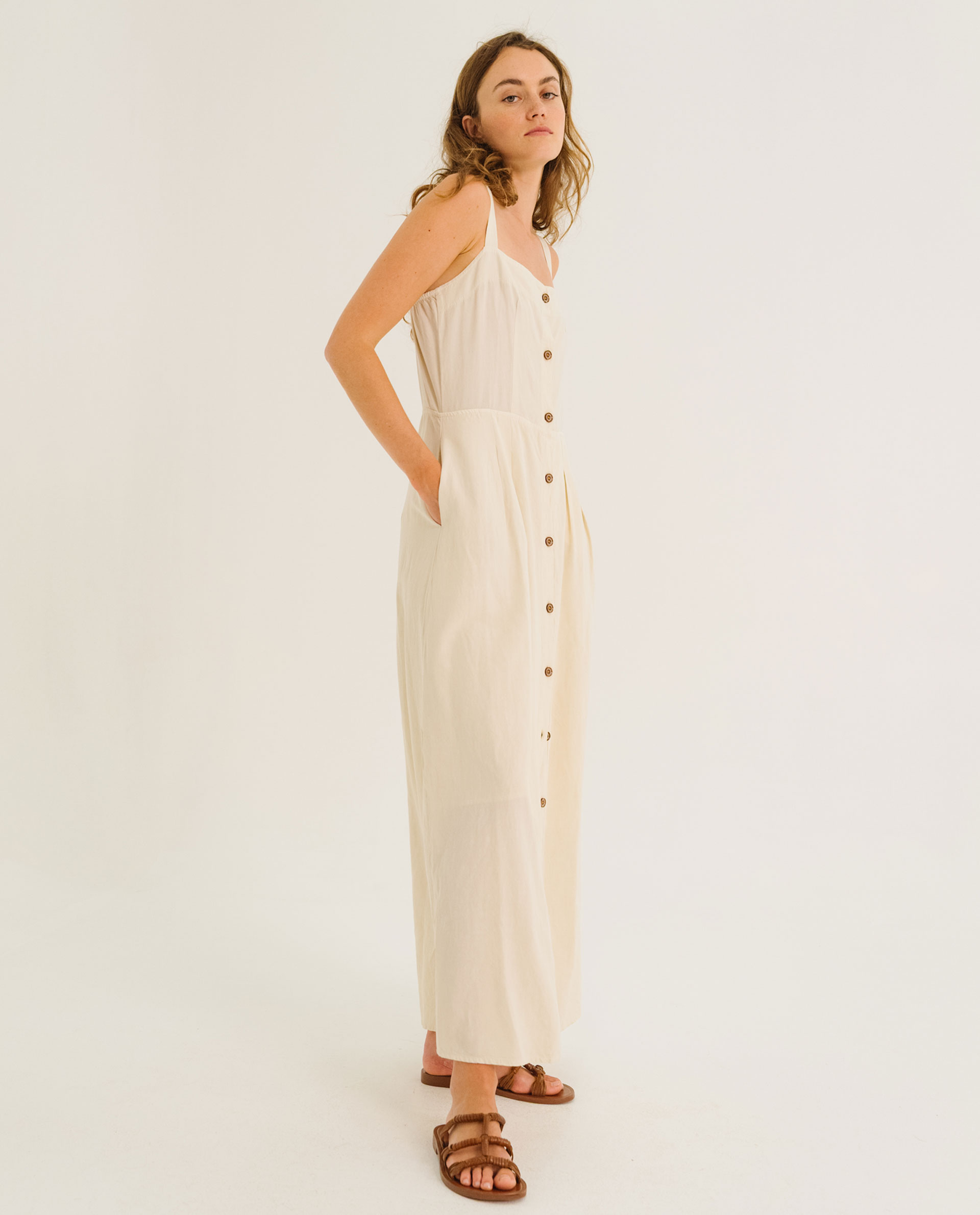 Robe à bretelle esprit “tablier”, boutonnée sur le devant par de jolis boutons contrastés.