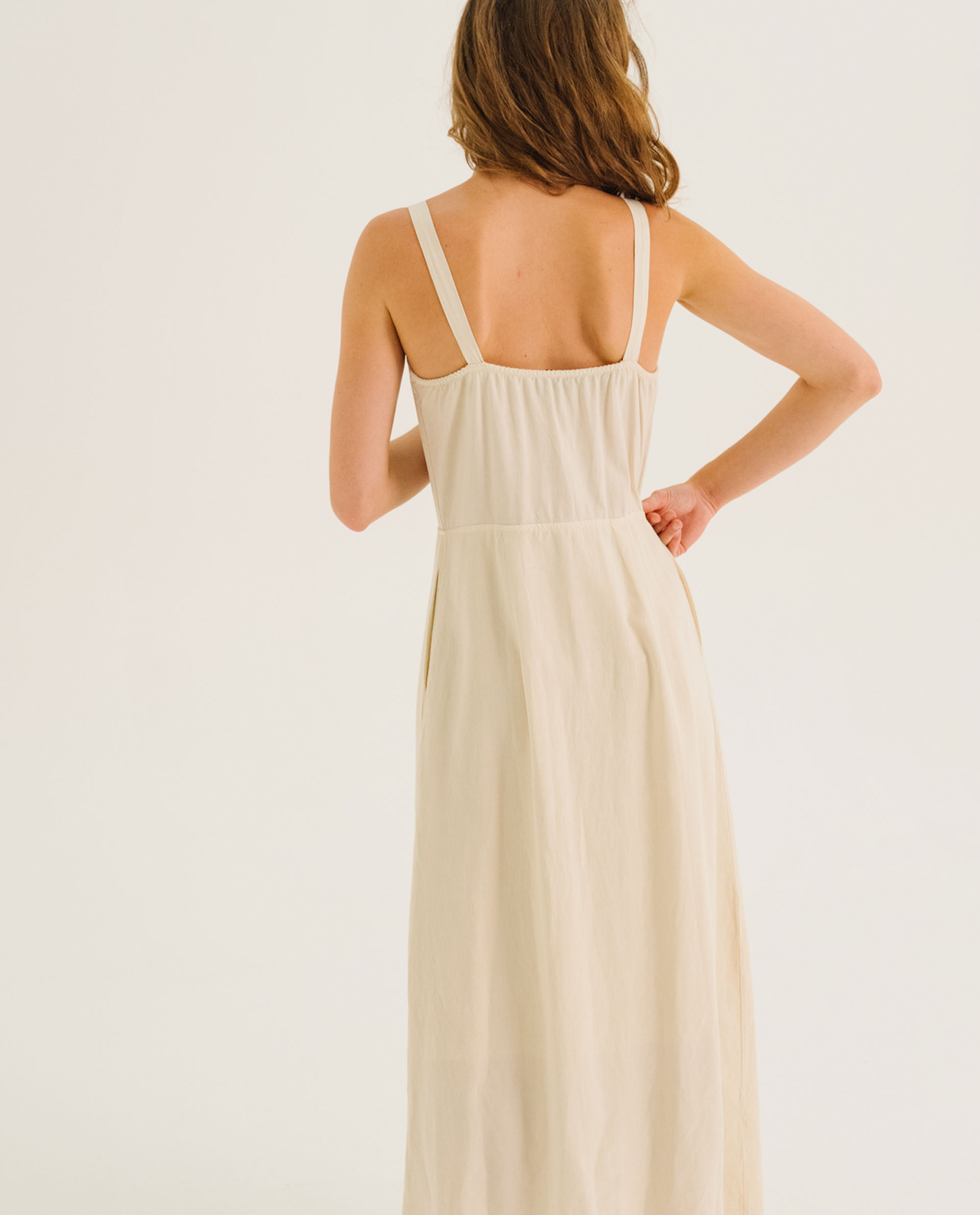 Le haut du dos est élastiqué pour s’adapter au mieux à votre morphologie. Le bas de robe est doublé.